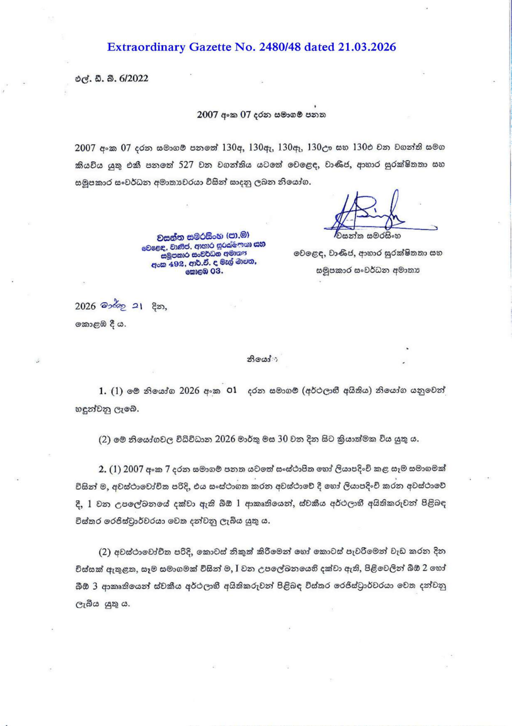 Extraordinary Gazette No. 2480/48 dated 21.03.2026 View : Order – නියමය